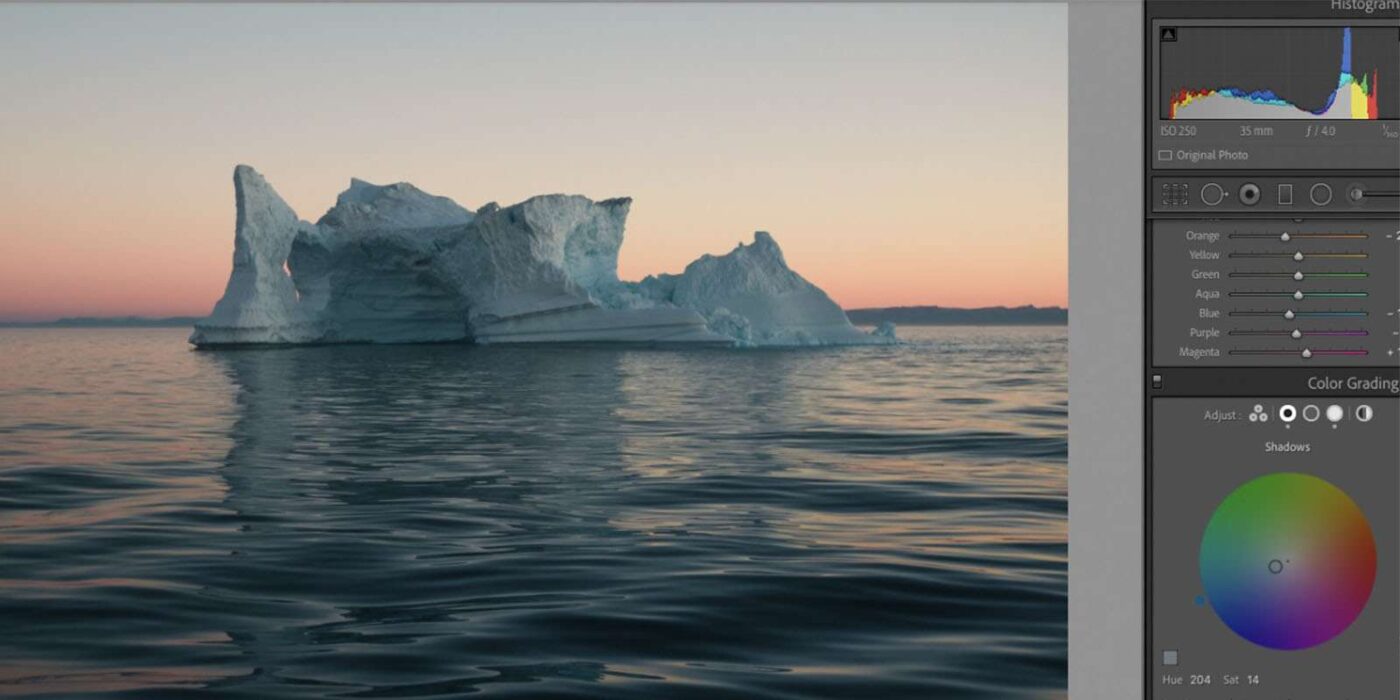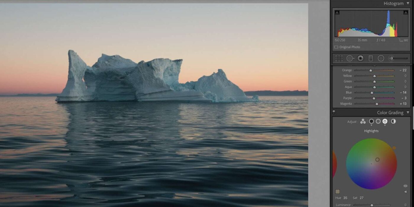 Colour grading time. I?m going to drastically change the hues, saturation and luminosity values of the colours. My goal here is to add contrast through colours. I want to utilize the warm background to make my water and iceberg really pop. In my photographs, I love to use colour theory to add contrast to a scene to make the subject stand out organically.