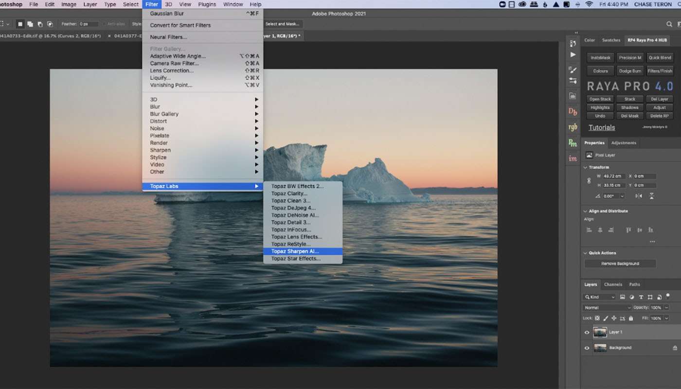 With that top layer selected go to Filter down to Topaz Labs (I?ll put a 15% off code at the bottom with the link) and to Topaz Sharpen AI.