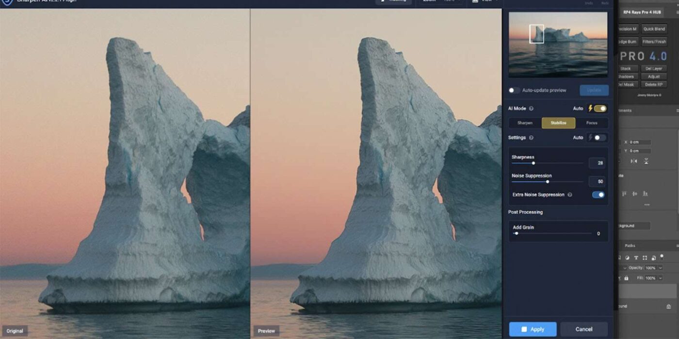 When you are in Topaz Labs Sharpen AI, you can use auto for everything and then click update to see the results. Once you have the results you can override them and adjust as necessary. In this case, it oversharpened the scene so I manually reduced the sharpen output.