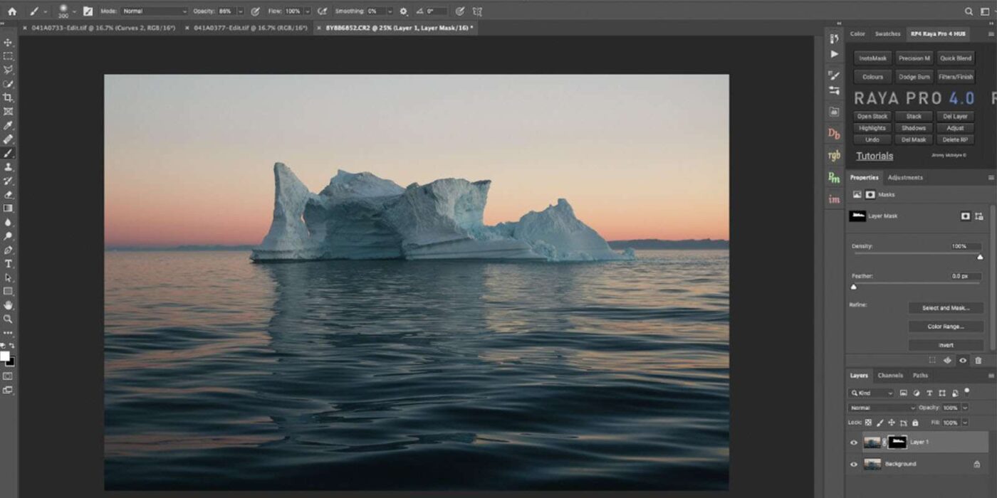 Then I click Apply and let it load. Once that loads, I create a black layer mask to hide all of the sharpening that I just created. Black masks hide everything while white reveals what?s underneath. So in this case we do not want to sharpen the entire image so we must hide that sharpening effect with a black mask and then go use a white paint brush with the black layer mask selected and outline the iceberg, or the subject that we want sharp. Typically you should just focus on what is in your focal plane to determine what should be sharpened and what shouldn?t be.